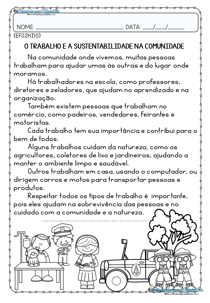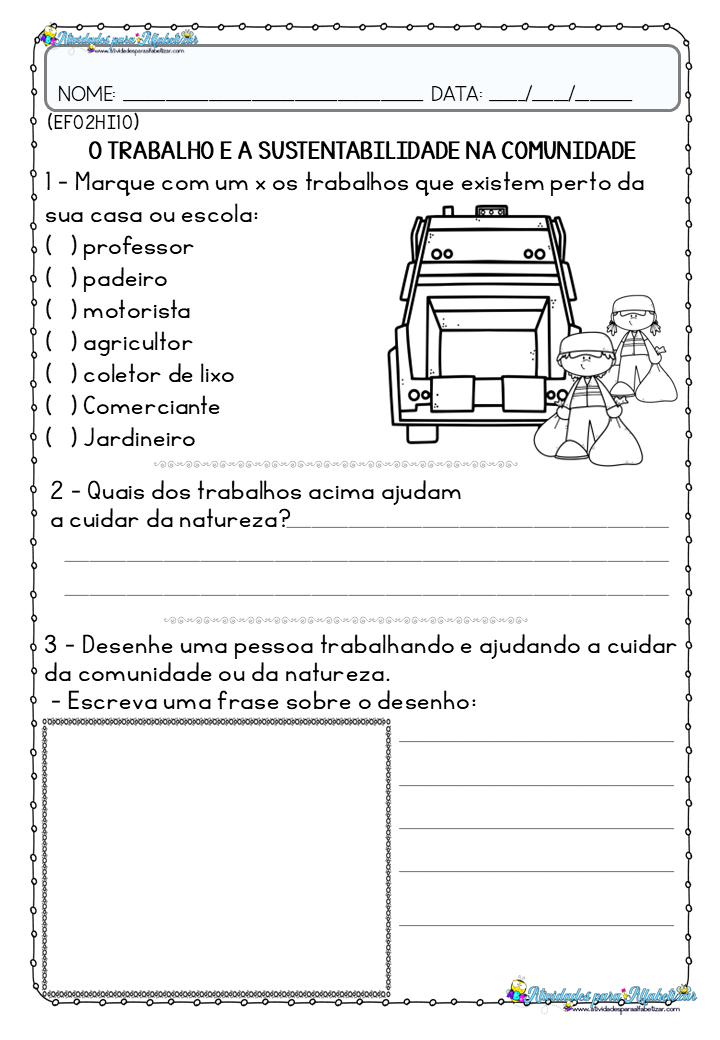 A proposta também inclui um momento de produção criativa, no qual o aluno deve desenhar uma pessoa trabalhando e ajudando a comunidade ou a natureza, além de escrever uma frase sobre o desenho.
