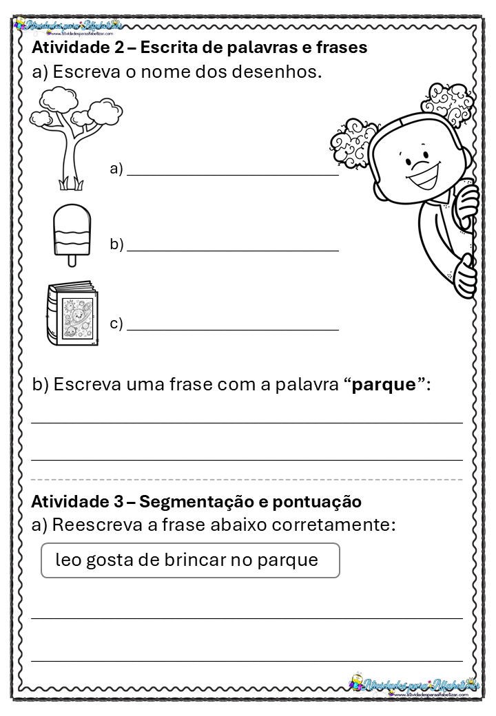 - Língua Portuguesa: leitura de palavras e textos curtos, compreensão leitora, escrita de palavras e frases;