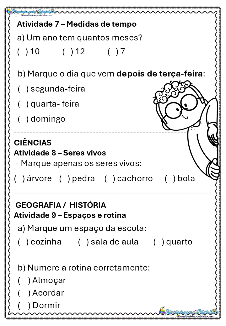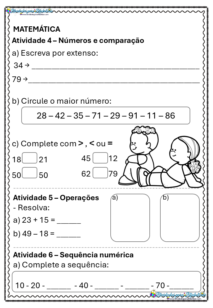 - Matemática: números até 100, operações de adição e subtração, sequências e noções de tempo;