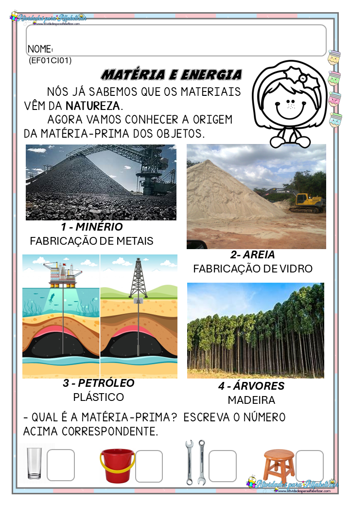 Em uma atividade prática, a criança deve identificar a matéria-prima correspondente aos objetos, como copo, balde, chave e banquinho, reforçando a relação entre natureza, matéria-prima e produto final.