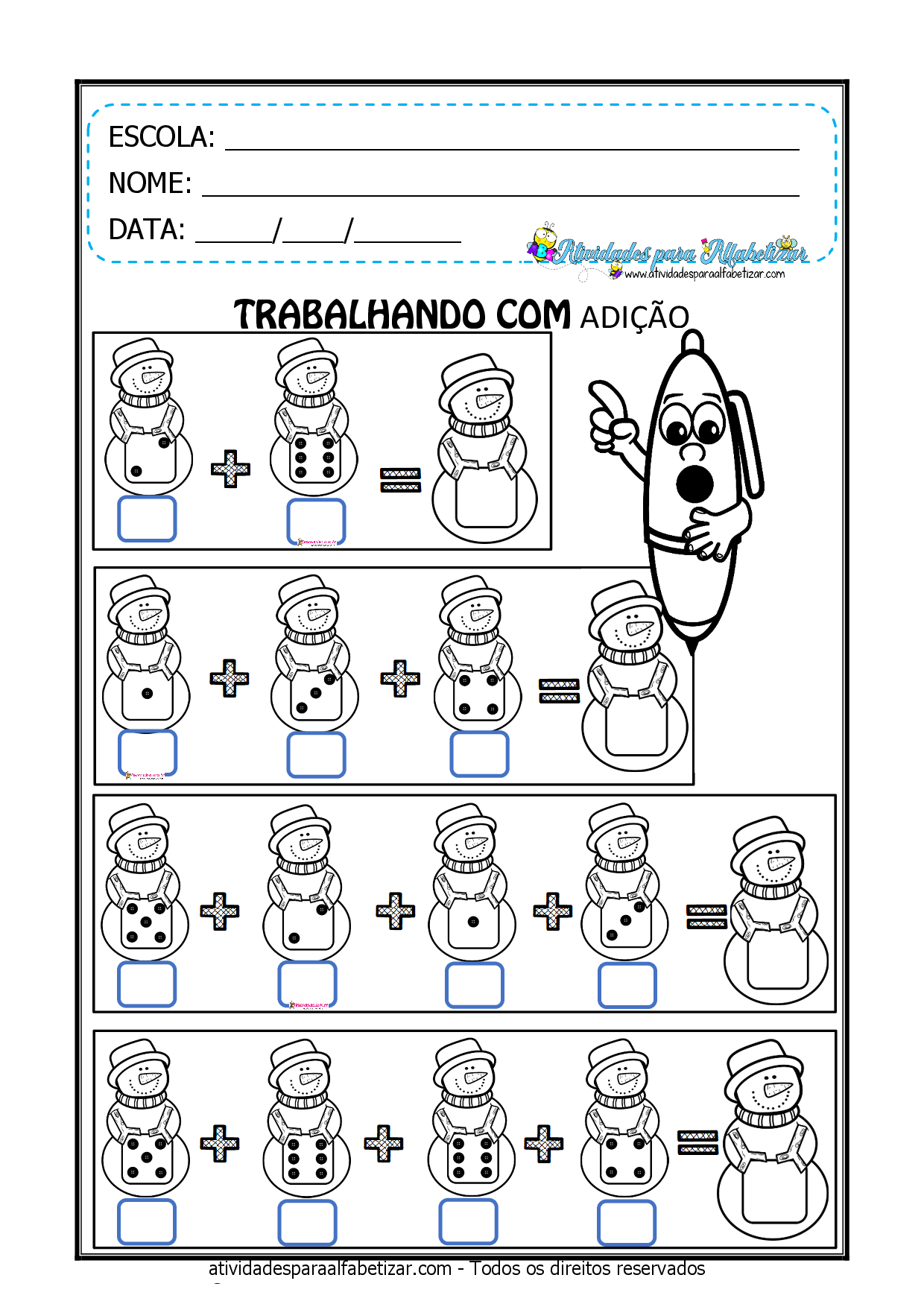 A imagem de bonecos de neve (como a que você vê acima) é excelente para explorar o sistema de numeração com os alunos. Além de divertida, ela pode ser adaptada para diversas propostas didáticas. Veja algumas ideias práticas: